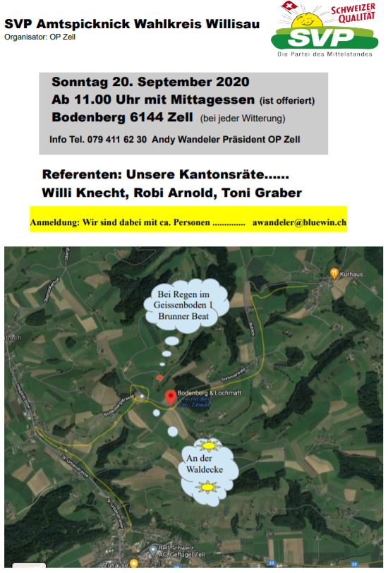 Am 20. September 2020 findet das Amtspicknick der SVP Wahlkreis Willisau statt.